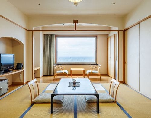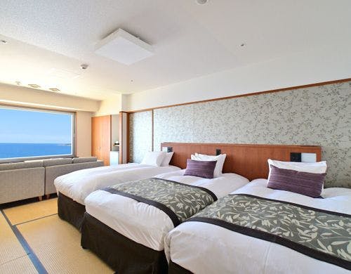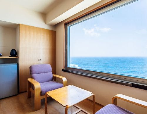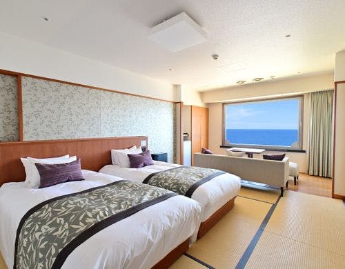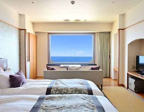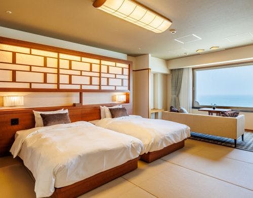 水のテラスのインフィニティ空間で愉しむ足湯、スィートを含む多くの客室種類、全室オーシャンフロントで海に心を潤す宿。