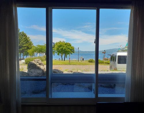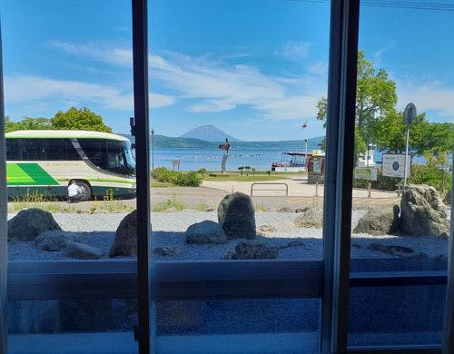 洞爺湖湖畔に立つ四階建の旅館ですぐ目の前に遊覧船乗場があります。