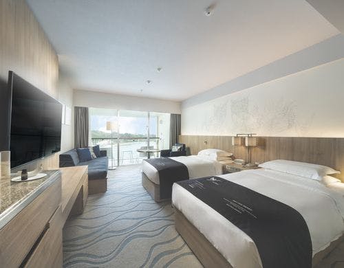 客室の特徴全室がバルコニー付きのオーシャンビュー設計です。スイートルームや和室などがあり、最大7人対応可能なフリッパーズコネクティングでは海をイメージした空間が広がります。多様なスタイルの部屋が揃い、快適に過ごせる空間が整っています。