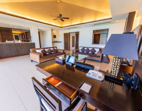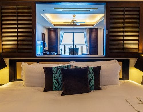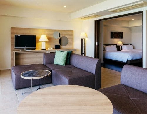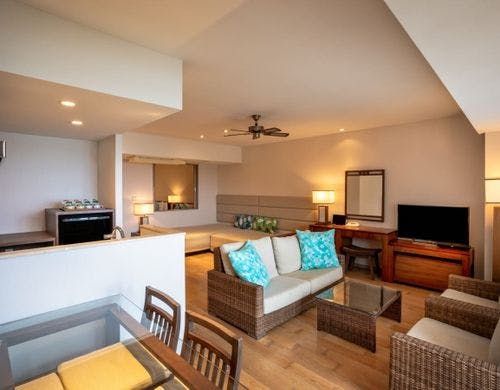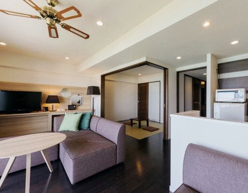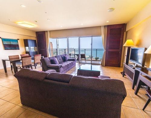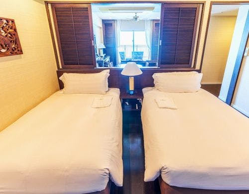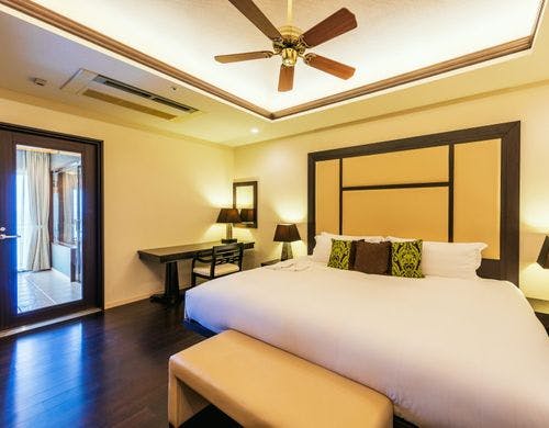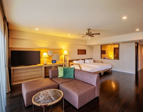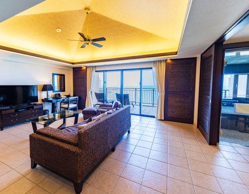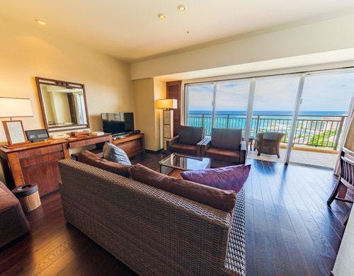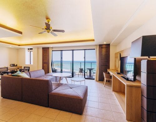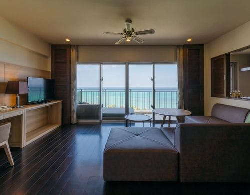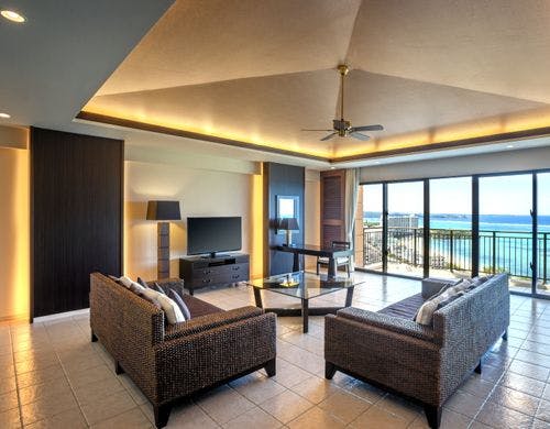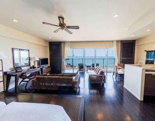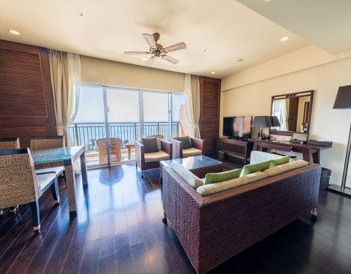 客室は平均で70平米の寛ぎのオーシャンビュー。全室に備え付けのバルコニーからは碧い海が広がり、美しい夕陽が包み込みます。