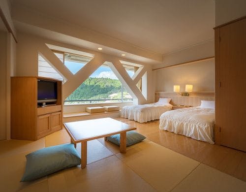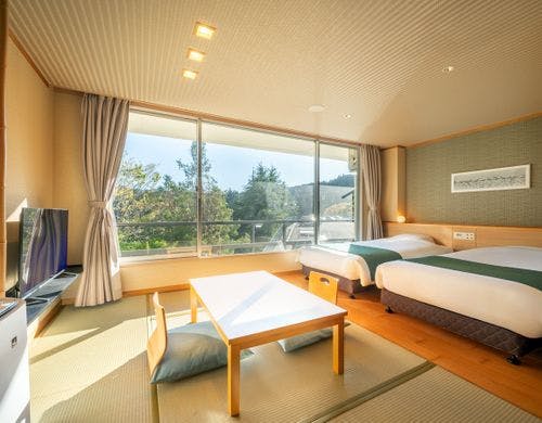 客室は海側と山側から選べます。特に海側客室では、松島湾の絶景が広がり、心安らぐひとときを過ごせます。一部の客室は2024年にリニューアルされ、木の温もりを基調とした和洋室や、静寂な雰囲気を満喫できる和室も用意されています。