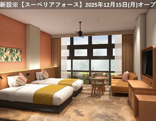 施設内のレストランでは、40種類以上のメニューが楽しめるライブキッチンバイキング、地元食材を使用した和食膳、本格的な懐石料理を選択できます。また、全天候型プール、水着で入れる温泉、スリル満点のスライダーを含む6つのテーマパークを完備しています。