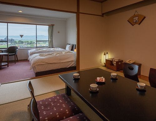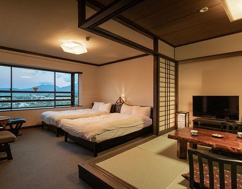 - 内牧温泉の中心。阿蘇駅/車で約10分・阿蘇くまもと空港/車で約45分・熊本IC/車で約55分・福岡空港/車で約2時間
