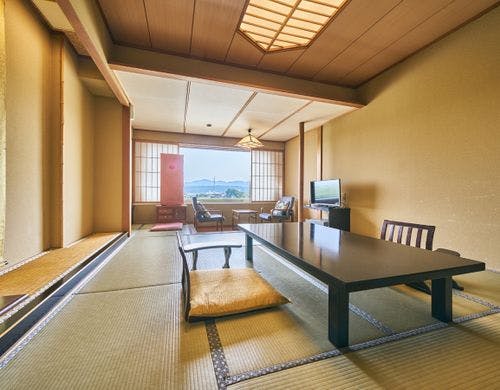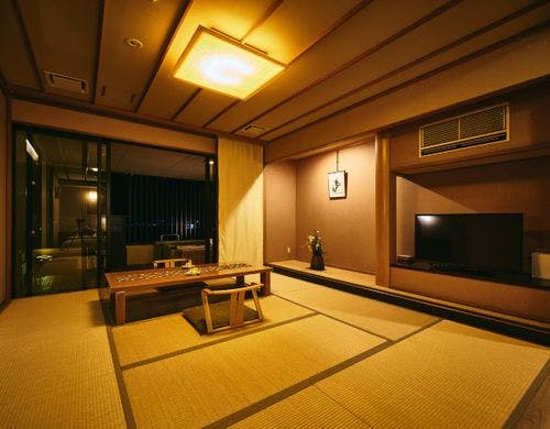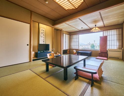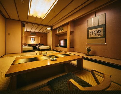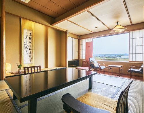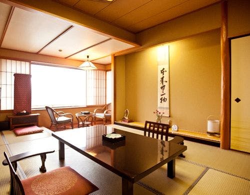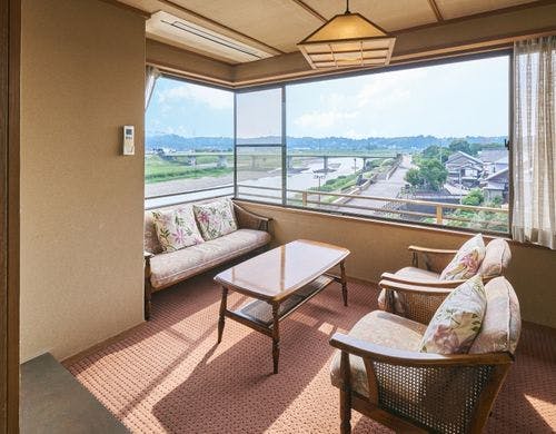 客室露天風呂付の和洋室【水鏡庵】と純和室【鹿門亭】の2棟からなる老舗旅館。旬の素材豊かな創作会席料理は個室のお食事処で。