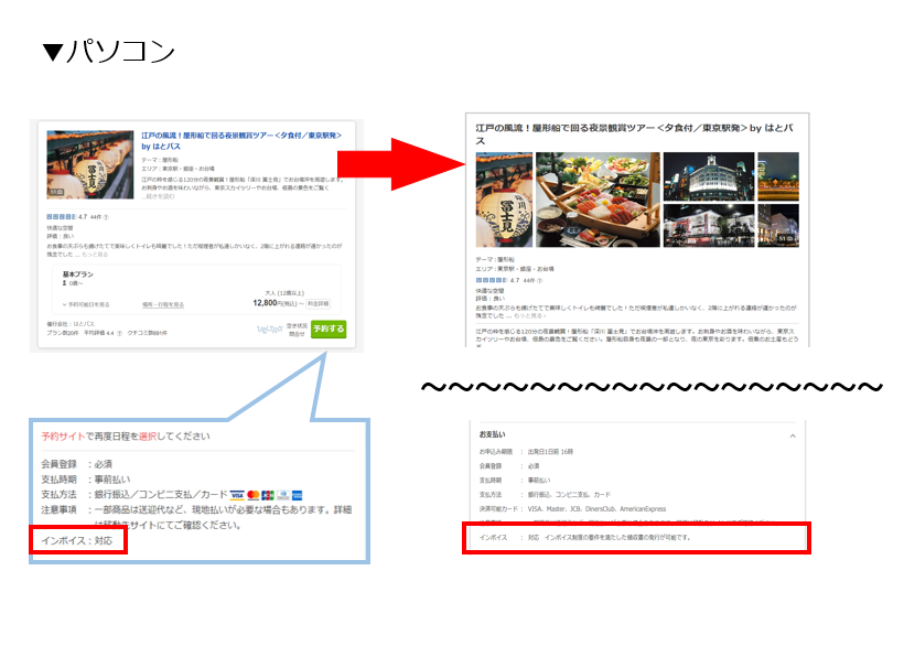 なお、プラン一覧画面・プラン詳細画面にて各プランのインボイス対応可否について記載しております。ただし、プランによって異なる場合や不明の場合がございますので、詳細につきましては、ご予約手続きを行った予約サイトまで直接お問い合わせください。