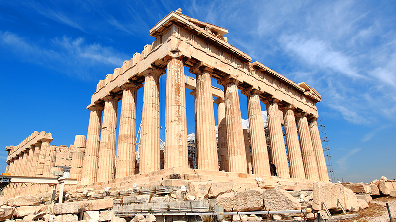 アテネの観光スポットといえば、ギリシャ古代遺跡を代表する「アクロポリス」。アクロポリスとは「高いところ」を意味し、古代では聖域とされていました。ここには古代アテネ人の高度な文明を窺い知ることができるギリシャ建築が集まり、その繊細な彫刻には現代人の心をも惹きつけるものがあります。