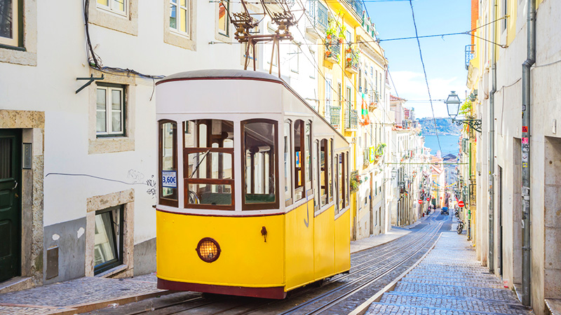 路面電車が石畳の丘に行き交ったり、狭い壁の通りをすり抜けるなど、リスボンならではの体験をすることができますよ。
