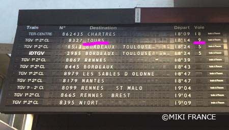 例えば、このパネルで2列目のTGV8327、TOURS(トゥール)行き18:14発は、Voie 9と表示されているので、9番のホームに向かいます。