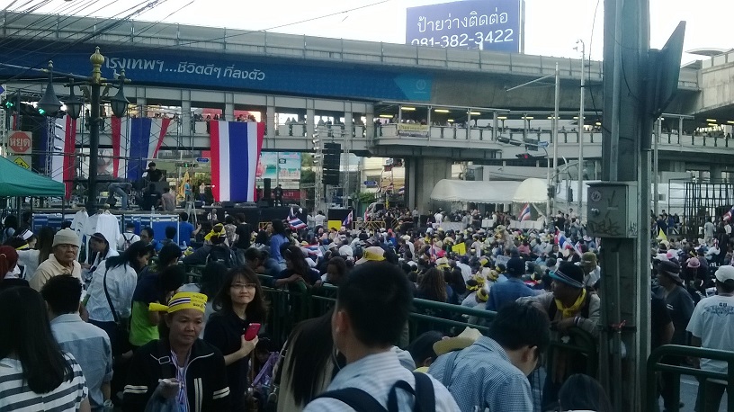 …交差点中央に大型ステージを設置しており、交差点の交通はチットロムのアマリンプラザからラチャダムリ方面への左折のみ開放している以外は全て遮断されています。
