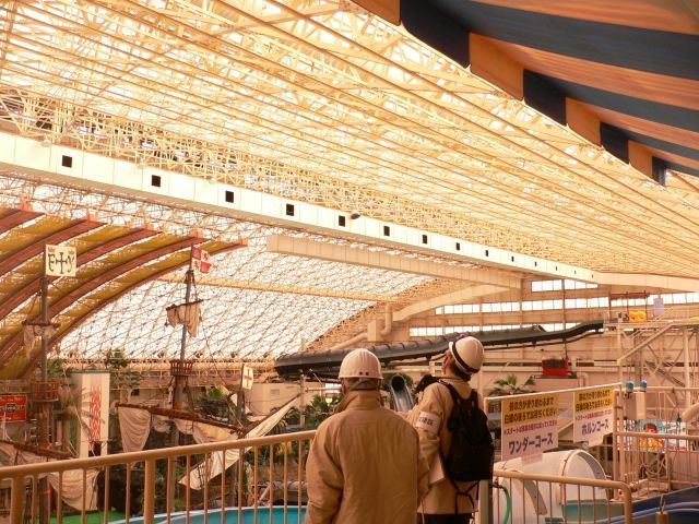ウォーターパークの安全点検の様子(左)とホテル外壁補修の様子(右)