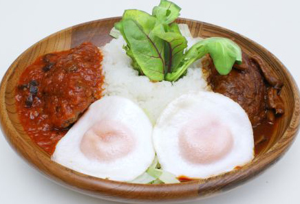 トマトソースとデミソースで味つけしたハンバーグが2個、さらに目玉焼きが2つもついてボリューム満点!