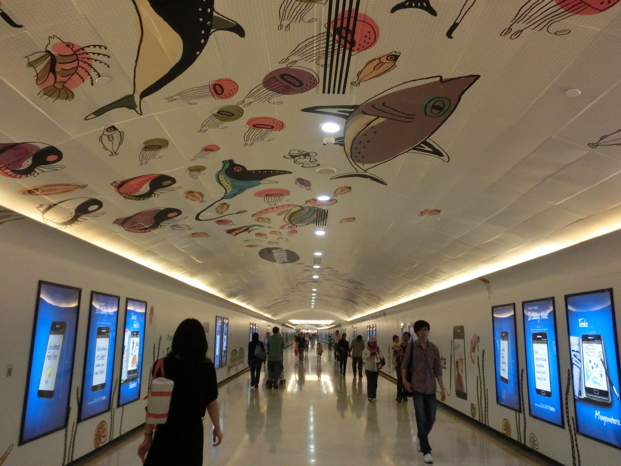 この通路、いつもこんな感じで壁も天井も広告に使われてます。