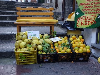 アマルフィーはレモンの産地で有名ですが、まさか町のあちこちで こんなにレモンがどーんと置いてあるとは思いませんでした。とにかくどこを見てもレモン、レモンという感じで鮮やかな黄色が目に付きます。普通のレモンに比べると4,5倍大きくゴツゴツした感じです。