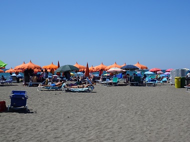 まずローマから車で片道40分ぐらいで行けるFREGENE 圧倒的にローマ人が多いです。ローマ人でここに海の家(別荘)を所有し、夏の約3ヶ月をこの別荘で過ごし、ローマまで通勤する人もいます。砂浜ですし子供連れの家族が多いです。