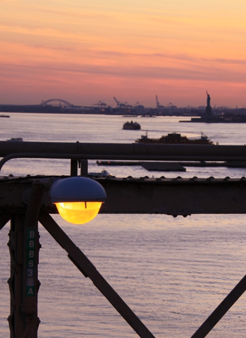 以前、この橋の昼間の様子はご紹介したことありますが、夕方から夜はたぶん初めて。特にこれからの季節、暖かくなってきたからいいですよー。橋の上から、マンハッタンの摩天楼の夕焼け&夜景のを楽しみたいって方はどうぞ参考にしてください。写真いっぱいあるので、まずは夕焼け、サンセット・タイムの様子から。ただでさえ気持ち良い川の上の空間ですが、オレンジ色に包まれるといっそう神秘的に・・・。夕焼けのオレンジが日本より濃い感じ?刻々と変わっていく景色を眺めてると、何とも言えない気持ちよさを感じます。
