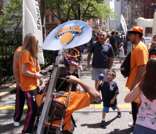 Tribeca Film Festivalのストリート・フェア風景より。映画祭のストリート・フェアなんですけど、ファミリー向けということで、結構がっつりと家族で楽しめるスポーツ・コーナーも。これじゃ映画祭っていうか体育祭?パフォーマンスやショーのほか、体験型のアトラクションもいっぱい。バスケやホッケーの仮設コートとかまで作られてます。