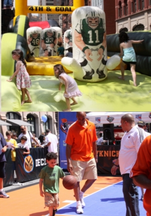 最近は日本でもビジネス・スポーツ・マネジメントっていう考え方が取り入れられてきて、地元のファンとの交流イベントなども盛んに行われるようになってきたようですね。本場米国では、地元のファンとの交流を昔からとても大切にしてまして、こういう感じの地元の地域振興イベントとかにもプロ・スポーツチームがちょくちょく参加。さすがに慣れてまして、子ども達が楽しめるいろいろな遊び道具も準備万全! さらにプロスポーツ・チームだけじゃなくて、スポーツ専用ケーブルTV局まで一緒にこういうイベントに参加するようになってたりするんです。興味深いですね。