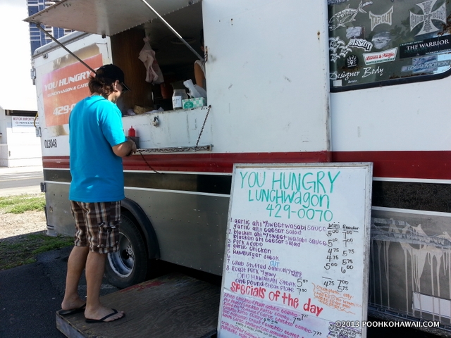先週、You Hungry? (ユーハングリー/ユー・ハングリー)というランチワゴンでプレートランチを買いました? 場所は今話題のカカアコ。昔はコンベンションセンター前にお店があったんですが、今はワゴンになりました。ダウンタウンに近いこともあり、昼時にはビジネスマン・ウーマンがランチを買いに来ます。