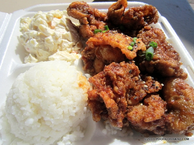 人気は「ガーリックアヒのワサビソースがけ」。お昼過ぎに行くと売切れています(sold out)。今回私たちが行ったのは1時過ぎ。やはり、ガーリックアヒはソールドアウトでした。夫は「ブラックンアヒのワサビソースがけ」、夫の家族が「ガーリックチキン」、私は「クラブ・スタッフド・サーモン」をゲット。私たちはそのままプレートランチを持って、カカアコウォーターフロントパークで食べました。