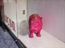 まずはショッキングピングのカバ。大阪エキ近のショウウィンドウに裸で安置させられていました。製作者はどんなメッセイジ性を盛り込んだのでしょうか。実物もこんな感じに赤いのでリアルではあるんですが。