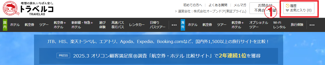 1. トラベルコサイト右上の「履歴・お気に入り」をクリック