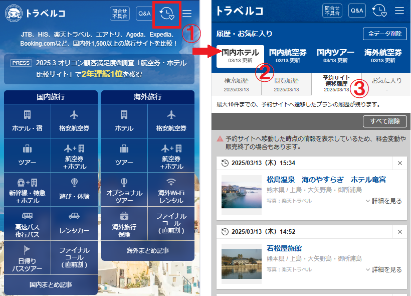 1. 履歴ボタン(トラベルコのページ右上の時計とハートのマーク)または下記リンクをタップ