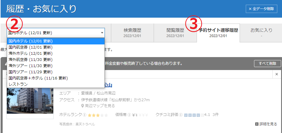 履歴やお気に入りを削除されたい場合は、ページ右上に「全データ削除」ボタンがありますので、そちらをご利用ください。