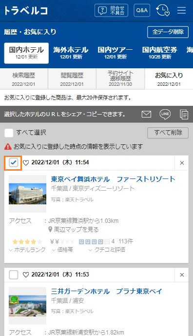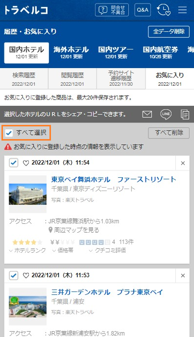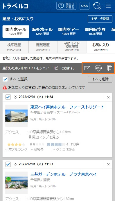 チェックボックスが選択された状態で、メール、LINE、コピーいずれかボタンを押すと、お気に入り情報をアプリ以外の場所へ移動しておくことができます。