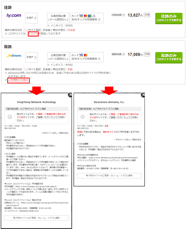 トラブル内容をご確認いただいたうえで、その予約サイトがご不安ということであれば、他の予約サイトの商品をご検討ください。