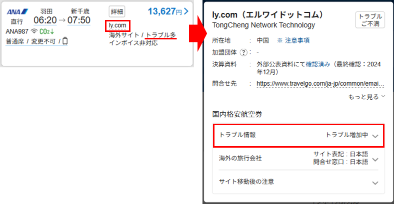 トラブル報告が増加している予約サイトに対し、「トラブル多」と表示をしております。