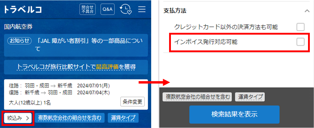 トラベルコの国内航空券検索ページでは、インボイス発行対応可能な予約サイトを絞り込んで検索することが可能です。