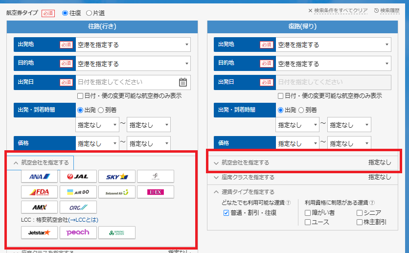 往復それぞれの航空会社を指定して検索することが可能です。