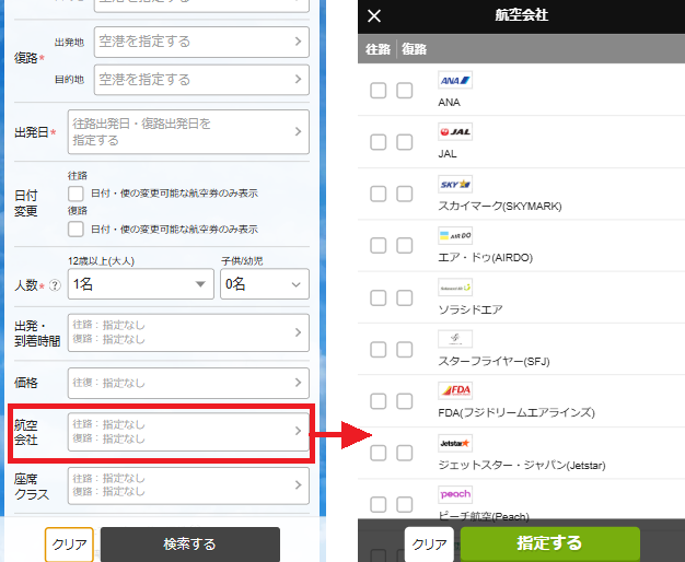 「航空会社」を押下し、往路/復路それぞれご希望の航空会社にチェックを入れて「指定する」ボタンを押下してください。