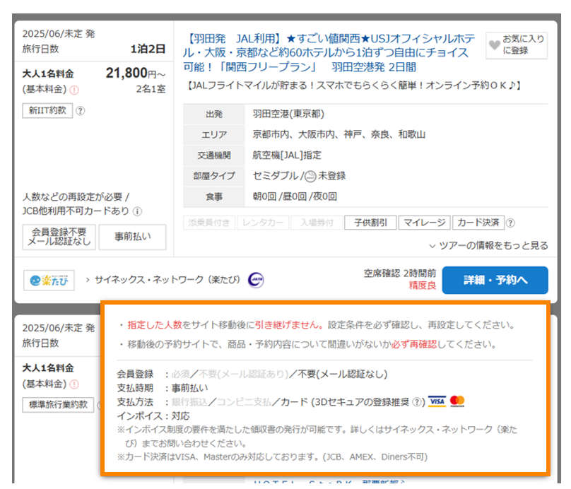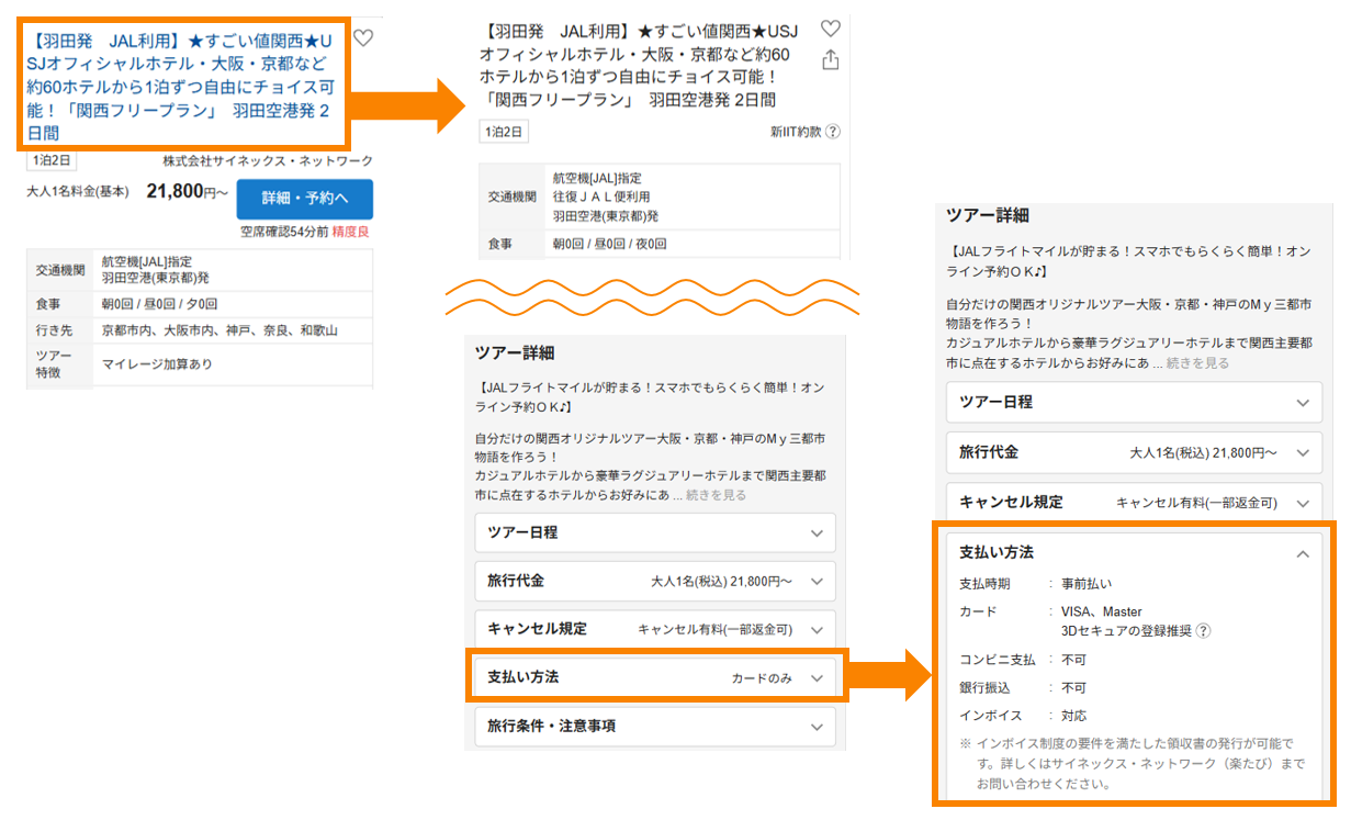 旅行会社やツアー商品によって選択できるお支払い方法が異なりますので、以下の操作にて、各商品の決済情報をご確認ください。