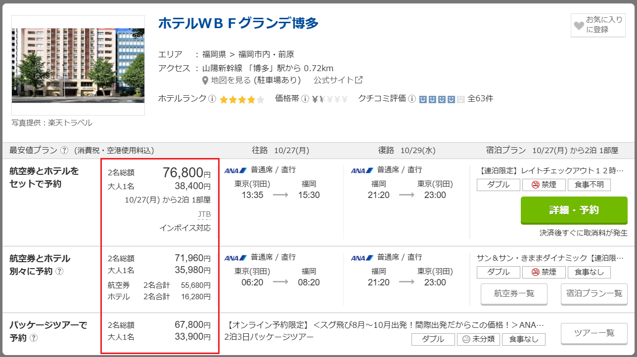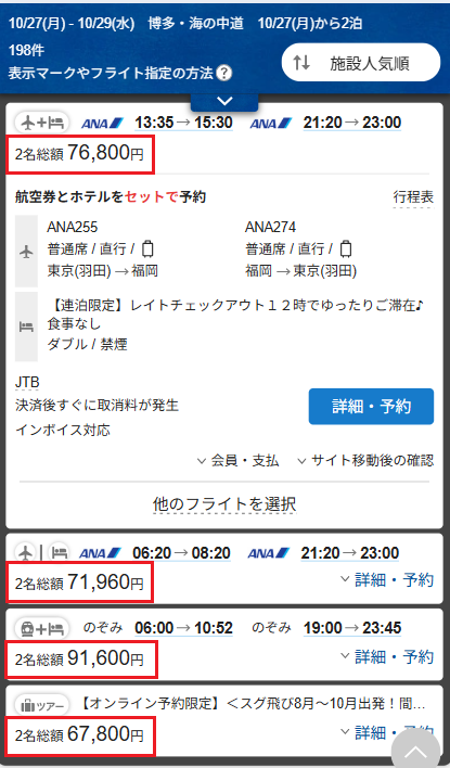 国内航空券+ホテル検索ページでは、参考商品として「航空券とホテル別々予約」「国内ツアー」商品が掲載されています。いずれも同様に、人数総額が表示されます(※PCのみ大人1名料金も表示)。予約サイトへ移動後にも、予約確定の前に必ず金額をご確認ください。