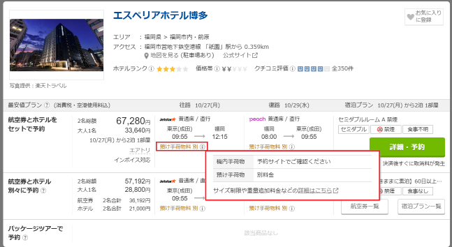 ※ただし、航空券とホテルを別々に予約する商品については、受託手荷物料金が含まれない場合があります。以下画像のアイコンや予約サイトの記載を必ず確認してください