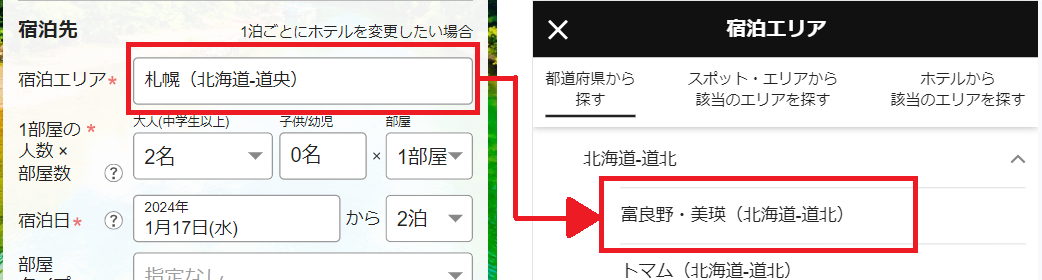 2.宿泊地の部分で希望のエリア(都市)へ再設定し検索