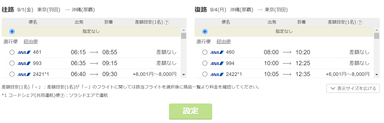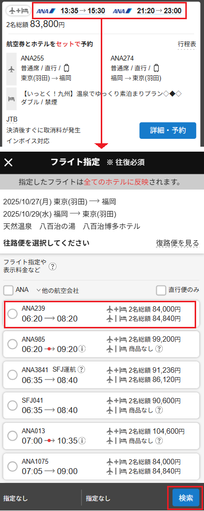 2.検索結果一覧画面上部にある「フライト指定」枠にてフライトを選択し、「設定」を押す