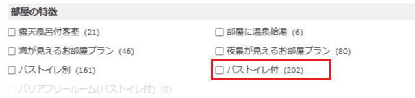 トラベルコの国内ホテル検索では、絞り込み条件より「バストイレ付」などの条件を指定して検索することが可能です。