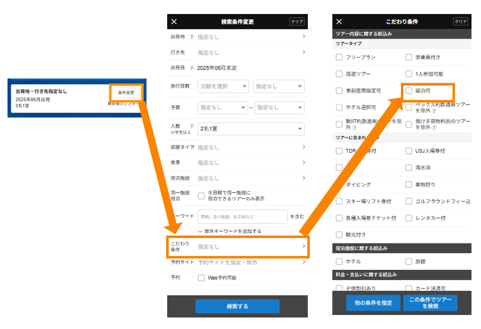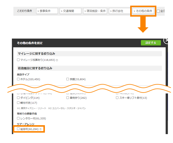 なお、トラベルコでは、延泊可能な商品のみを絞り込んで検索することができます。