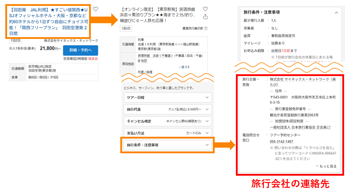 スマートフォンでは、一番下のほうまでページをスクロールし、「旅行条件・注意事項」を開くと旅行会社の電話番号や営業時間を確認することができます。