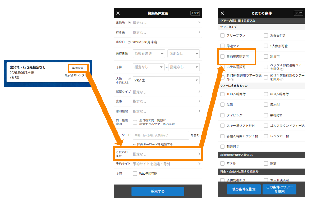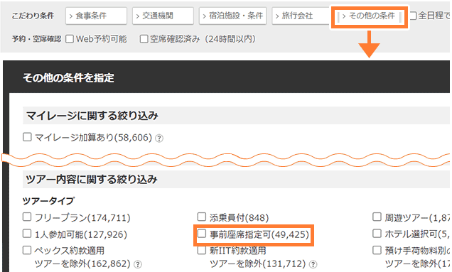 こだわり条件の「事前座席指定可」にチェックを入れて検索すると、事前に座席指定ができる旅行商品一覧が表示されます。