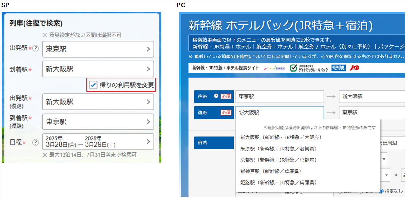 PC:往路区間を設定後、復路発着駅を選択する際に、複数の駅候補