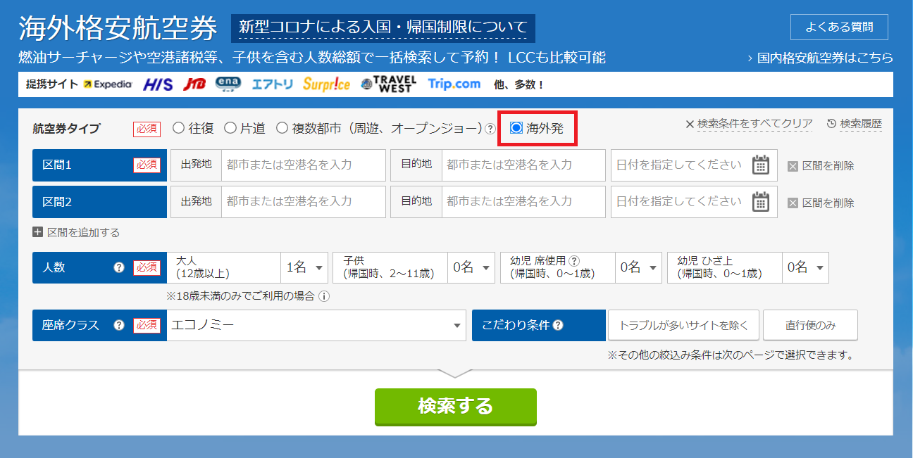 格安航空券トップページにて「航空券タイプ」の「海外発」を選んで検索してください。