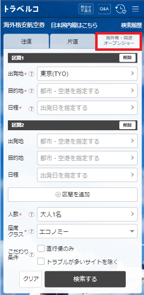 格安航空券トップページにて「海外発・周遊オープンジョー」のタブをクリックして検索してください。