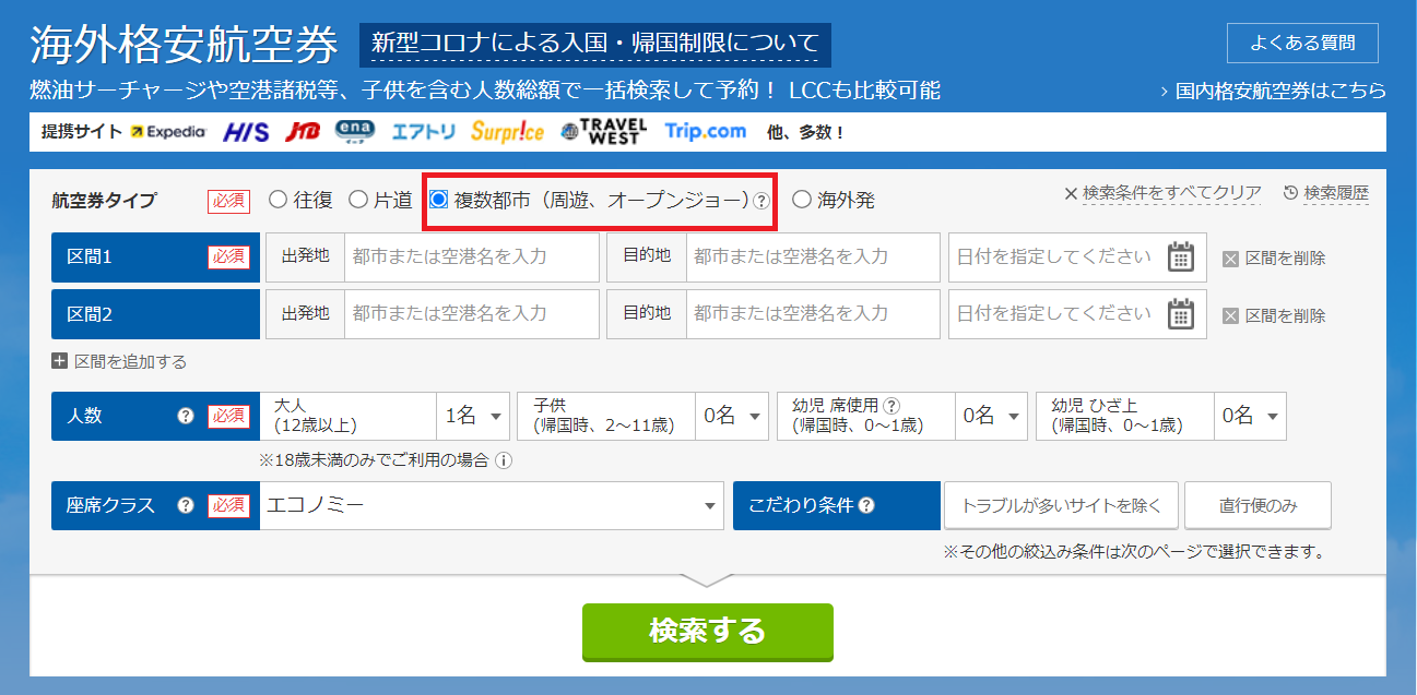 複数の都市を訪問する航空券を検索する場合は、海外格安航空券検索ページにて最大6区間まで指定ができます。