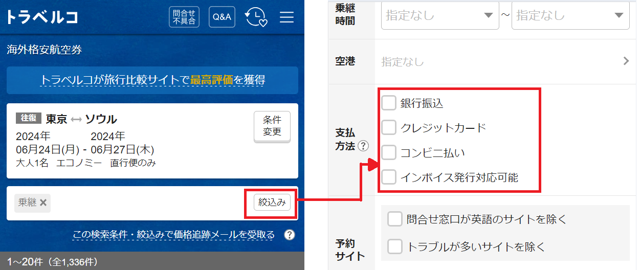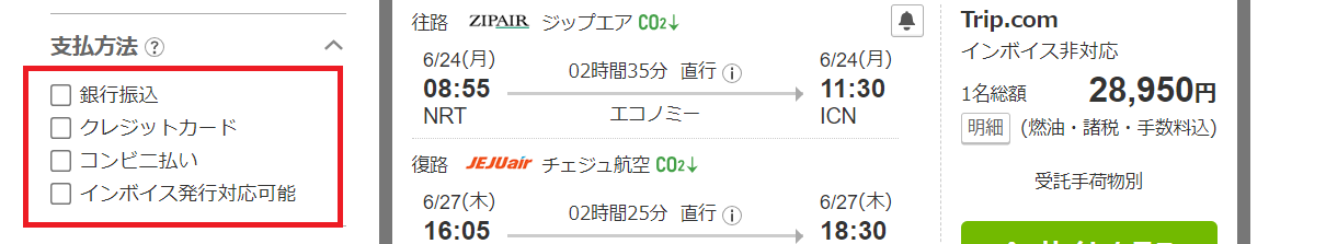 海外航空券メニューでは銀行振込、クレジットカード、コンビニ払いから支払方法を絞り込んで検索することが可能です。