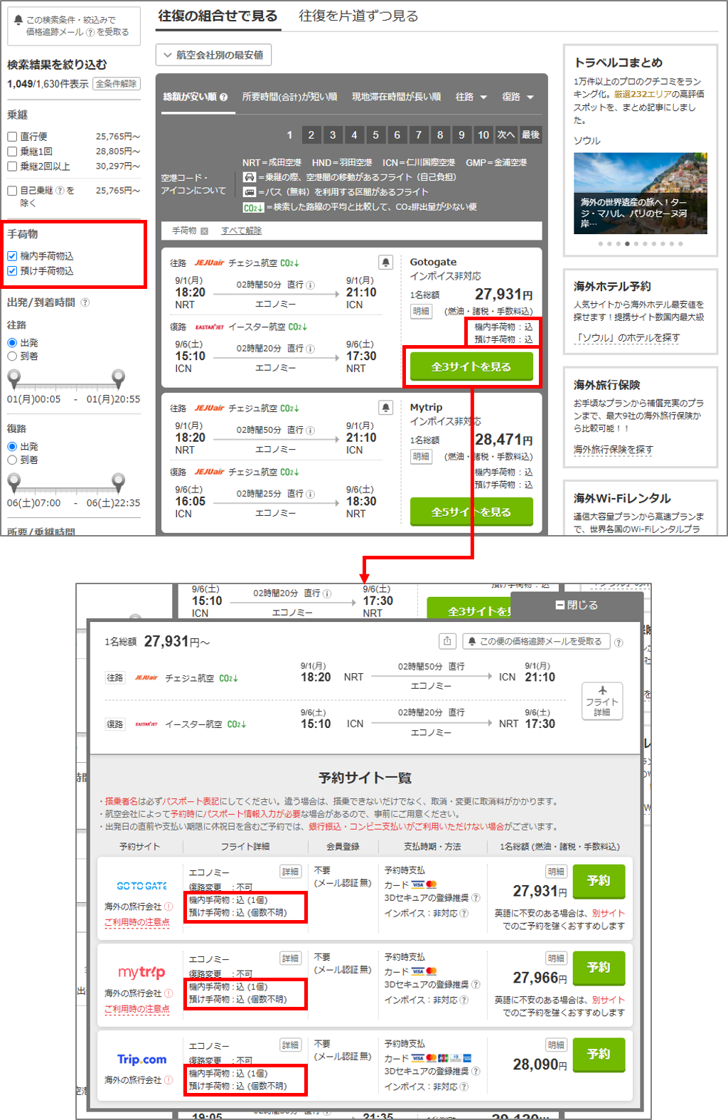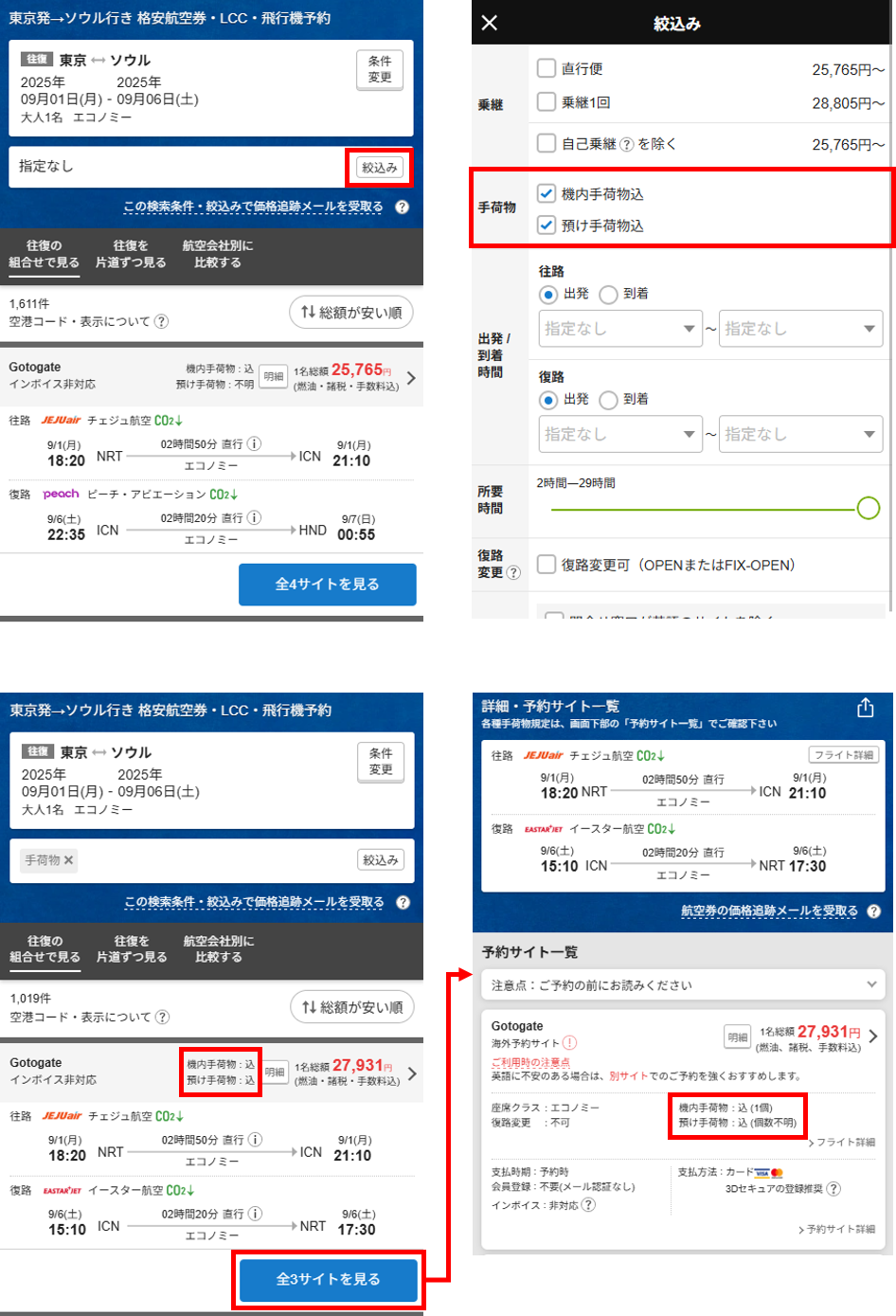 - 予約サイトごとに機内手荷物・預け手荷物情報が表示される
