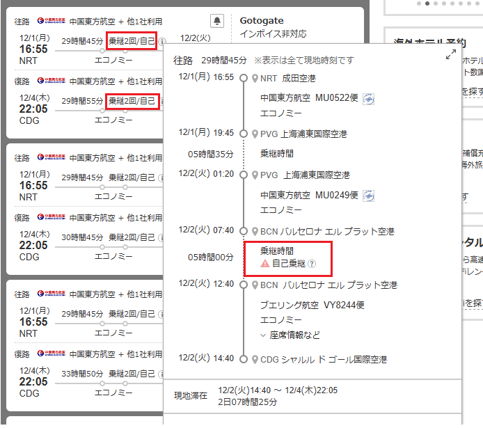 検索結果一覧ページにて「乗継回数●回/自己」と記載がある場合は、自己乗継を含む航空券です。