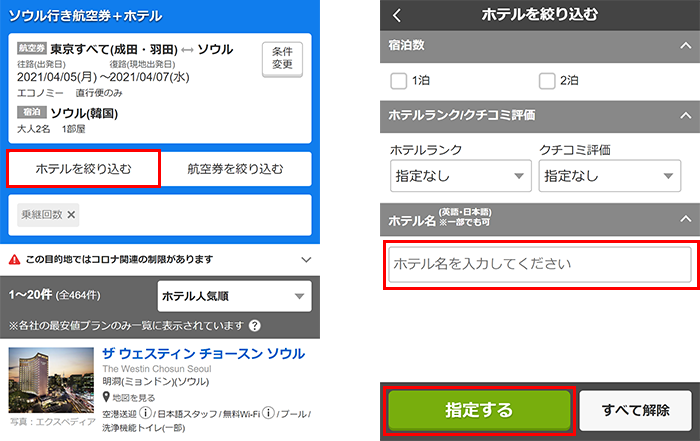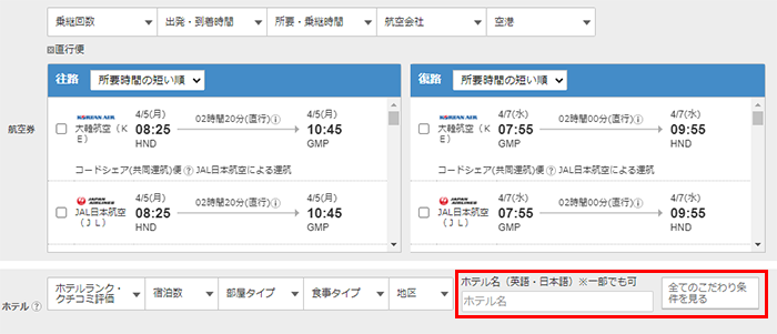 海外航空券+ホテルではホテル名を指定して検索結果を絞り込むことが可能です。